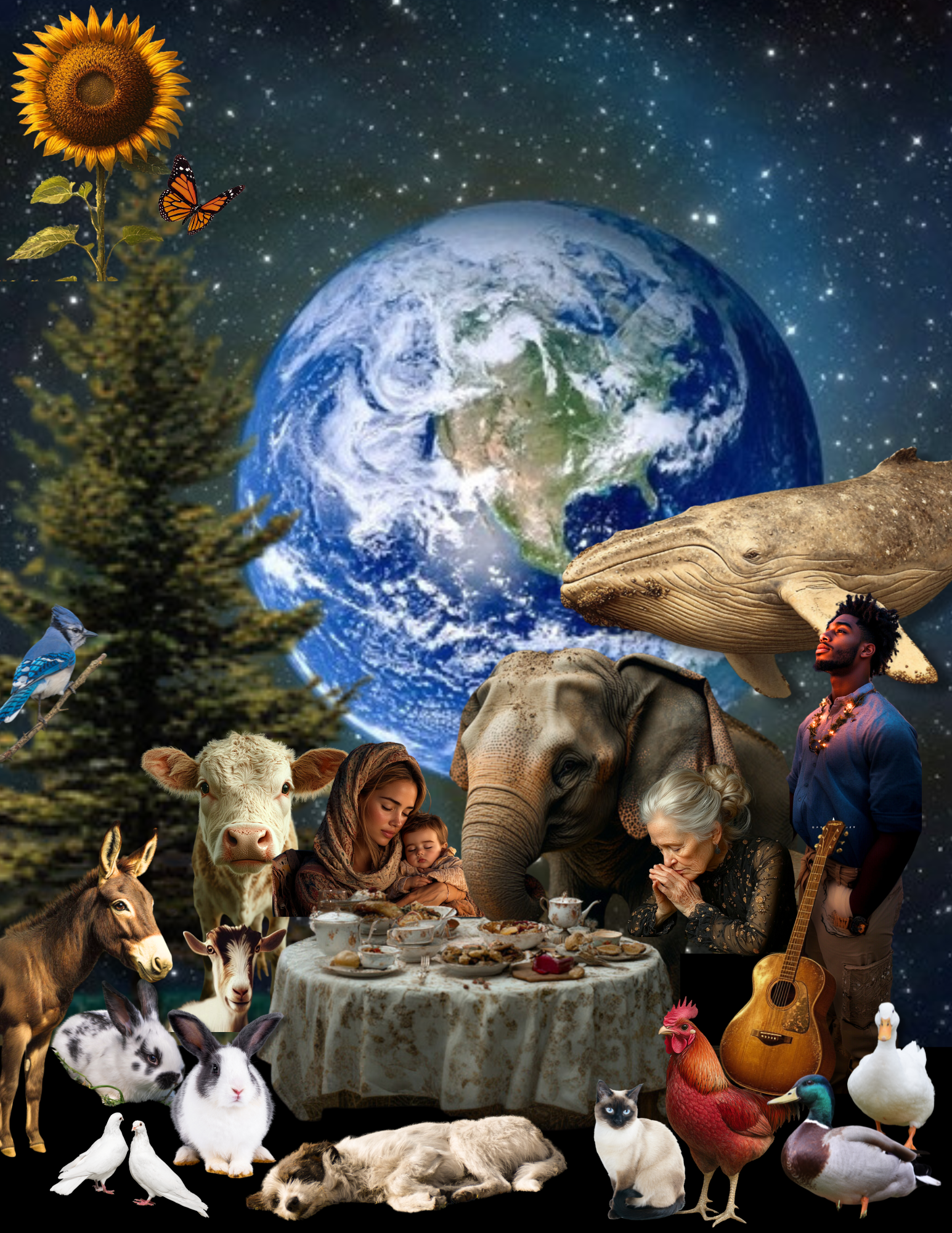 An Interspecies Prayer, I love you, I love you, I love you. Amen a one woman play, sing along, cosmic mass and organizing meeting for companionship, contemplation, action and celebration. Call for booking in theater, churches, community centers beginning in July 2026